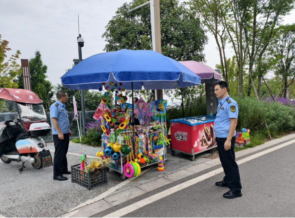 国庆期间,秋高气爽,景区迎来大量市民和游客。为维护良好游览秩序,专项小组在每日傍晚及人流高峰时段增派人员力量,加强巡查频次。工作人员耐心引导流动商贩至指定区域规范经营,确保摊点设置不影响交通和游客通行;及时将停放在主干道、影响通行的电动车辆移至安全区域;督促沿线商家严格落实“门前五包”责任,对占道摆放的桌椅等物品进行规范整理,切实保障道路畅通与环境整洁。
