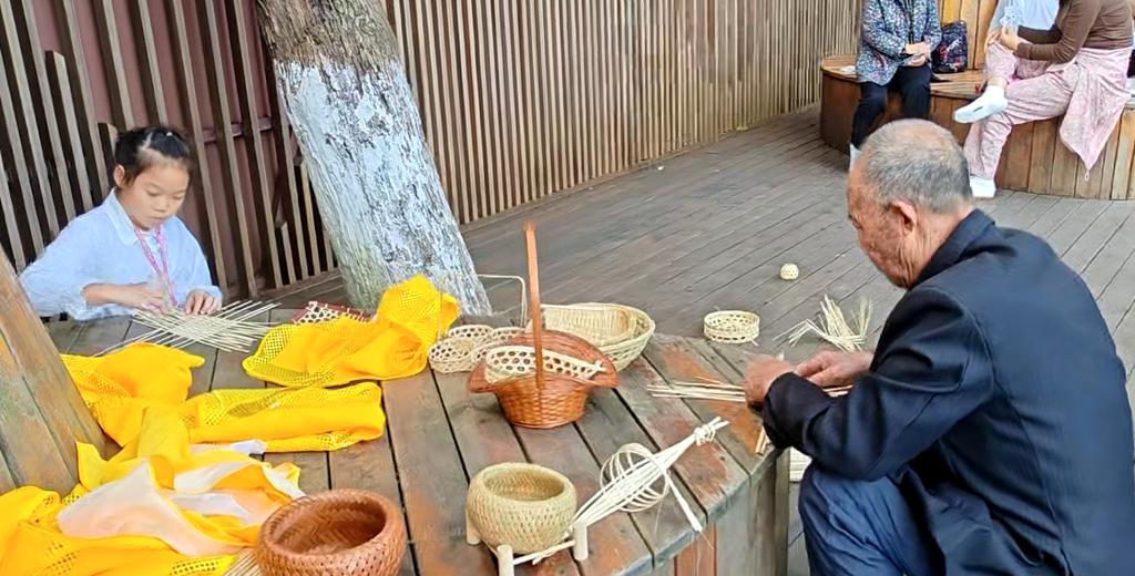 志愿导览之余,竹编体验区更成了景区“人气打卡点”。“小龙人”们邀请专业竹编手艺人现场教学,只见纤细的竹丝在指尖翻飞,转眼间便勾勒出简单的竹编图案。游客们纷纷围坐参与,从学习穿丝、压条的基础技法开始,沉浸式感受传统工艺的魅力。“第一次亲手编竹篮,虽然简单,但特别有成就感,这比单纯观光有意思多了!”带着孩子体验的张先生笑着展示成果。