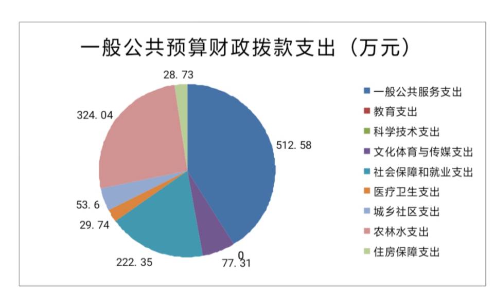 2018年一般公共预算财政拨款支出1248.34万元,主要用于以下方面:一般公共服务支出512.58万元,占41.06%;教育支出0万元,占0%;科学技术支出0万元,占0%;文化体育与传媒支出77.31万元,占6.19%;社会保障和就业支出222.35万元,占17.81%;医疗卫生支出29.74万元,占2.38%;城乡社区支出53.6万元,占4.29%;农林水支出324.03万元,占25.96%;住房保障支出28.73万元,占2.31%。