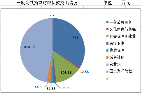 2018年一般公共预算财政拨款支出2294.36万元,主要用于以下方面:一般公共服务(类)支出781万元,占34.04%;文化体育与传媒(类)支出12.53万元占0.55%;社会保障和就业(类)支出308.56万元,占13.45%;医疗卫生(类)支出39.3万元,占1.7%;住房保障(类)支出31.85万元,占1.39%;城乡社区(类)支出44.3万元占1.9%;农林水(类)支出1074.12万元占46.82%.国土海洋气象(类)支出2.7万元占0.15%