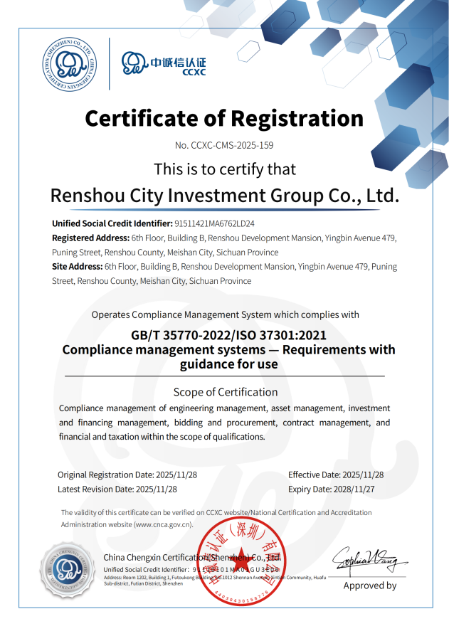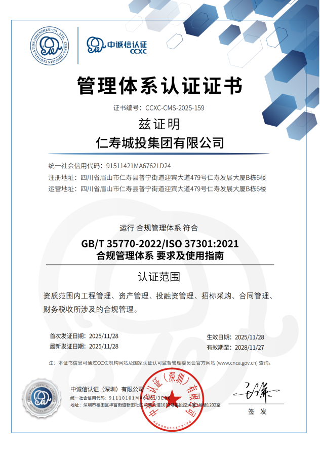 2025年11月28日,仁寿城投集团顺利通过中诚信认证有限公司的全面审核,成功取得GB/T35770-2022及ISO37301:2021合规管理体系国内、国际双认证,成为中诚信认证公司在四川省认证通过的第一家县属国有企业。本次认证范围覆盖工程管理、资产管理、投融资管理、招标采购、合同管理、财务税收等公司六大核心业务领域,认证的取得不仅标志着城投集团企业管理进一步迈入法治化、现代化、国际化的新阶段,更开启了县域企业合规治理的崭新篇章,成为引领县域国企合规发展新标杆。