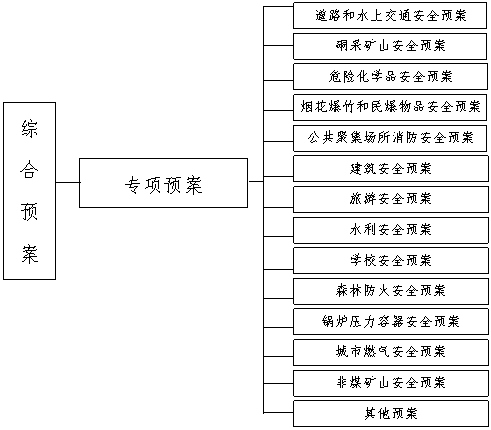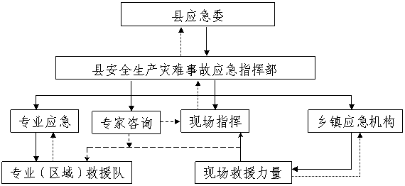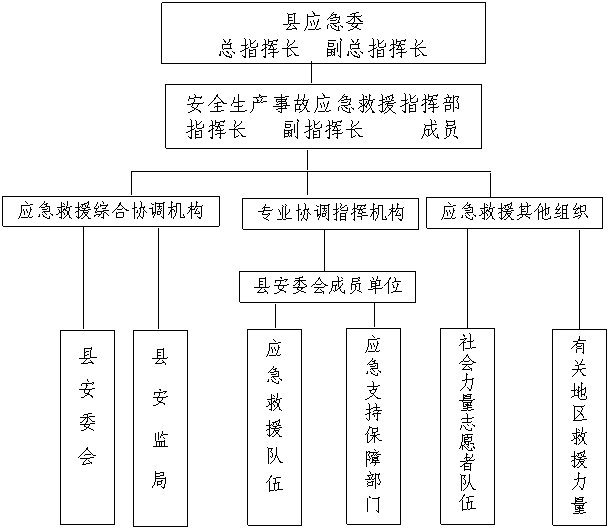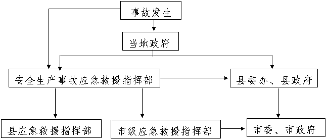 1.4工作原则 (1)以人为本,安全发展。把保障人民群众的生命安全和身体健康、最大程度地预防和减少安全生产事故灾难造成的人员伤亡作为首要任务。切实加强应急救援人员的安全防护。充分发挥人的主观能动性,充分发挥专业救援力量的骨干作用和人民群众的基础作用。 (2)统一领导,分级负责。在县政府统一领导和县安委会组织协调下,各乡镇人民政府、各园区管委会和县级有关部门按照各自职责和权限,负责有关安全生产事故灾难的应急管理和应急处置工作。企业要认真履行安全生产责任主体的职责,建立安全生产应急预案和应急机制。 (3)条块结合,属地为主。安全生产事故灾难现场应急处置的领导和指挥以县人民政府为主,实行乡镇人民政府行政首长、园区负责人负责制。县级有关部门密切配合,充分发挥指导和协调作用。必要时由县政府或县安委会直接组织指挥。 (4)依靠科学,依法规范。采用先进技术,充分发挥专家作用,实行科学民主决策。采用先进的救援装备和技术,增强应急救援能力。依法规范应急救援工作,确保应急预案的科学性、权威性和可操作性。 (5)预防为主,平战结合。贯彻落实“以人为本,坚持安全发展”的理念,及“安全第一,预防为主,综合治理”的方针,坚持事故灾难的应急与预防工作相结合。做好预防、预测、预警和预报工作,做好常态下的风险评估、物资储备、队伍建设、完善装备、预案演练等工作。 1.5名词解释 1.5.1安全生产事故 指在生产经营过程中发生的,造成或者可能造成重大人员伤亡、重大财产损失、重大生态环境破坏,影响和威胁社会秩序和公共安全的事件。 1.5.2应急救援 指一旦发生事故时,采取的消除、减少事故危害和防止事故恶化,最大限度降低事故损失的措施。 1.5.3预案 指根据预测可能发生的事故的类别、危害程度而制定的事故应急救援方案。预案的编制充分体现统一、协调、迅速、及时、有效地控制、排除事故隐患(事故灾难),真正起到抢险救灾作用。 1.6安全生产事故分类 分为特别重大事故(I级)、重大事故(Ⅱ级)、较大事故(Ⅲ级)、一般事故(Ⅳ级)四级预警。 1.6.1特别重大事故 是指造成30人以上死亡,或者100人以上重伤(包括急性工业中毒,下同),或者1亿元以上直接经济损失的事故; 1.6.2重大事故 是指造成10人以上30人以下死亡,或者50人以上100人以下重伤,或者5000万元以上1亿元以下直接经济损失的事故; 1.6.3较大事故 是指造成3人以上10人以下死亡,或者10人以上50人以下重伤,或者1000万元以上5000万元以下直接经济损失的事故; 1.6.4一般事故 是指造成3人以下死亡,或者10人以下重伤,或者1000万元以下直接经济损失的事故。 2基本情况 我县共有乡镇60个,村(居)委会619个,高速77.8公里、国道141.2公里、省道62.4公里、县道593.3公里、乡道534.1公里、村道1713.4公里,煤矿8家、金属非金属矿山91家,烟花爆竹生产企业1个、经营公司1个,危险化学品生产企业7家,经营公司110家,学校437所,医院81家,商场152家,农贸市场76个,宾馆116个,星级农家乐35个,网吧103家,渡口14个、人力摆渡船13艘、客船27艘,大、中、小型水库123座,压力容器316台、锅炉123台、电梯397台、起重机械266台。 3组织体系及相关机构职责 3.1组织体系 全县安全生产事故灾难应急救援组织体系由县安委会、县级有关部门、乡镇人民政府、园区管委会安全生产事故灾难应急领导机构、综合协调指挥机构、专业协调指挥机构、应急支持保障部门、应急救援队伍和生产经营单位组成。 县安全生产事故灾难应急领导机构为县安委会,综合协调指挥机构为县安办(安监局),县安全生产应急救援指挥中心具体承担安全生产事故灾难应急管理工作,专业协调指挥机构为县级有关部门管理的专业领域应急救援指挥机构。 乡镇人民政府、园区管委会的安全生产事故灾难应急机构由乡镇人民政府、园区管委会确定。 县应急救援队伍由县公安消防大队、县公安局交管大队、县武警中队、矿山救护队、110指挥中心、120急救中心等专业应急救援队伍,生产经营单位的应急救援队伍,社会力量,志愿者队伍及有关地区救援力量组成。 应急救援的后勤保障机构由县政府办、县财政局、县交通运输局、县卫生计生局、县民政局等组成。 3.2应急救援机构组织 3.3 3.3应急救援指挥部组成及职责 事故应急救援指挥部设在县安办(安监局) 指挥长:县政府县长 副指挥长:县政府分管副县长 成员:县政府办公室、县监察局、县政府新闻办、县应急办、县发改局、县经信局、县公安局、县财政局、县民政局、县教育体育局、县卫生计生局、县人社局、县重交办、县国土资源局、县安监局、县交通运输局、县住建局、县规划局、县水务局、县农业局、县林业局、县畜牧兽医局、县环保局、县旅游局、县文广新局、县商务局、县粮食局、县投资促进局、县城市行政执法局、县农机局、县民宗局、县气象局、县广播电视台、县食品药品监管局、县公安局交管大队、县公安消防大队、汪洋循环经济园区管委会、富加工业园区管委会、县工商质监局、县总工会、县路政大队、县运管所、中国邮政仁寿分公司、县供销社、国网仁寿县供电公司、仁寿电信分公司、仁寿移动分公司、仁寿联通分公司、黑龙滩灌区管理处、文林工业园区管委会、天府新区仁寿视高管委会、眉山天府花海观光农