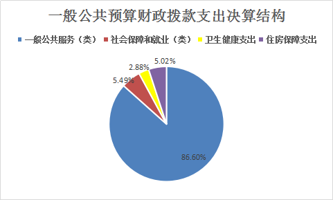 2019年一般公共预算财政拨款支出304.22万元,主要用于以下方面:一般公共服务(类)支出263.46万元,占86.6%;教育支出(类)0万元,占0%;科学技术(类)支出0万元,占0%;文化旅游体育与传媒(类)支出0万元,占0%;社会保障和就业(类)支出16.71万元,占5.49%;卫生健康支出8.77万元,占2.88%;住房保障支出15.28万元,占5.02%。