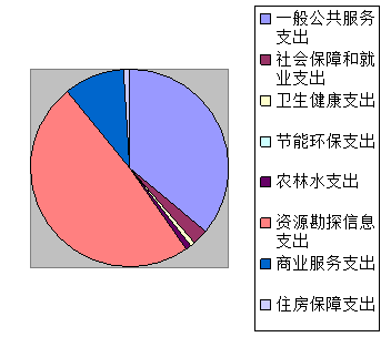 2019年一般公共服务拨款支出2547.67万元,占总支出的32.8%;社会保障和就业支出175.99万元,占总支出的2.26%;卫生与健康支出51.37万元,占总支出的0.6%;节能环保支出5万元,占总支出的0.06%;农林水支出53.5万元,占总支出的0.69%;资源勘探信息等支出3462.5万元,占总支出的44.6%;商业服务业等支出696.9万元,占总支出的8.9%;住房保障支出64.86万元,占总支出的0.84%。