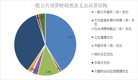 2019年一般公共预算财政拨款支出3543.24万元,主要用于以下方面:一般公共服务(类)支出1459.06万元,占41.2%;教育支出(类)0万元,占0%;科学技术(类)支出0万元,占0%;文化旅游体育与传媒(类)支出41.7万元,占1.2%;社会保障和就业(类)支出406.51万元,占11.5%;卫生健康支出105.91万元,占3%;节能环保(类)支出15.69万元,占0.4%;城乡社区支出73.7万元,占2.1%;农林水支出1270.13万元,占35.8%;灾害防治及应急管理支出44万元,占1.2%;住房保障支出126.54万元,占3.6%。