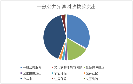 2019年一般公共预算财政拨款支出1897.61万元,主要用于以下方面:一般公共服务(类)支出628.29万元,占33.11%;文化旅游体育与传媒(类)支出11.63万元,占0.61%;社会保障和就业(类)支出296.73万元,占15.64%;卫生健康支出(类)支出39.78万元,占2.1%;节能环保(类)支出40.43万元,占2.12%;城乡社区(类)支出41.5万元,占2.19%;农林水(类)支出766.41万元,占40.39%;住房保障(类)支出54.83万元,占2.89%;灾害防治及应急管理(类)18万元,占0.95%。(罗列全部功能分类科目,至类级。)