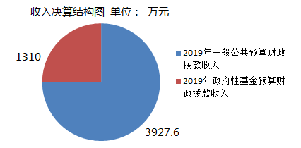 2019年本年收入合计5237.6万元,其中:一般公共预算财政拨款收入3927.6万元,占74.99%;政府性基金预算财政拨款收入1310.0万元,占25.01%;上级补助收入0万元,占0%;事业收入0万元,占0%;经营收入0万元,占0%;附属单位上缴收入0万元,占0%;其他收入0万元,占0%。