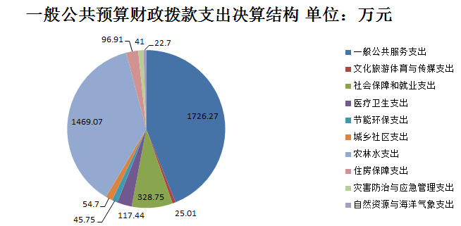 2019年一般公共预算财政拨款支出3927.6万元,主要用于以下方面:一般公共服务(类)支出1726.27万元,占43.95%;文化旅游体育与传媒(类)支出25.01万元,占0.64%;社会保障和就业(类)支出328.75万元,占8.37%;医疗卫生(类)支出117.44万元,占2.99%;节能环保(类)支出45.75万元,占1.17%;城乡社区(类)支出54.7万元,占34.49%;农林水(类)支出1469.07万元,占37.4%;自然资源海洋气象等支出22.7万元,占0.58%;住房保障(类)支出96.91万元,占2.47%;灾害防治及应急管理(类)支出41万元,占1.04%。