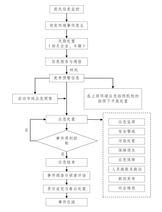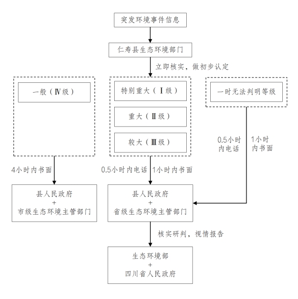 附录1 国家突发生态环境事件分级标准 一、特别重大突发生态环境事件 凡符合下列情形之一的,为特别重大突发生态环境事件: 1.因环境污染直接导致30人以上死亡或100人以上中毒或重伤的; 2.因环境污染疏散、转移人员5万人以上的; 3.因环境污染造成直接经济损失1亿元以上的; 4.因环境污染造成区域生态功能丧失或该区域国家重点保护物种灭绝的; 5.因环境污染造成设区的市级以上城市集中式饮用水水源地取水中断的; 6.Ⅰ、Ⅱ类放射源丢失、被盗、失控并造成大范围严重辐射污染后果的;放射性同位素和射线装置失控导致3人以上急性死亡的;放射性物质泄漏,造成大范围辐射污染后果的; 7.造成重大跨国境影响的境内突发生态环境事件。 二、重大突发生态环境事件 凡符合下列情形之一的,为重大突发生态环境事件: 1.因环境污染直接导致10人以上30人以下死亡或50人以上100人以下中毒或重伤的; 2.因环境污染疏散、转移人员1万人以上5万人以下的; 3.因环境污染造成直接经济损失2000万元以上1亿元以下的; 4.因环境污染造成区域生态功能部分丧失或该区域国家重点保护野生动植物种群大批死亡的; 5.因环境污染造成县级城市集中式饮用水水源地取水中断的; 6.Ⅰ、Ⅱ类放射源丢失、被盗的;放射性同位素和射线装置失控导致3人以下急性死亡或者10人以上急性重度放射病、局部器官残疾的;放射性物质泄漏,造成较大范围辐射污染后果的; 7.造成跨省级行政区域影响的突发生态环境事件。 三、较大突发生态环境事件 凡符合下列情形之一的,为较大突发生态环境事件: 1.因环境污染直接导致3人以上10人以下死亡或10人以上50人以下中毒或重伤的; 2.因环境污染疏散、转移人员5000人以上1万人以下的; 3.因环境污染造成直接经济损失500万元以上2000万元以下的; 4.因环境污染造成国家重点保护的动植物物种受到破坏的; 5.因环境污染造成乡镇集中式饮用水水源地取水中断的; 6.Ⅲ类放射源丢失、被盗的;放射性同位素和射线装置失控导致10人以下急性重度放射病、局部器官残疾的;放射性物质泄漏,造成小范围辐射污染后果的; 7.造成跨设区的市级行政区域影响的突发生态环境事件。 四、一般突发生态环境事件 凡符合下列情形之一的,为一般突发生态环境事件: 1.因环境污染直接导致3人以下死亡或10人以下中毒或重伤的; 2.因环境污染疏散、转移人员5000人以下的; 3.因环境污染造成直接经济损失500万元以下的; 4.因环境污染造成跨县级行政区域纠纷,引起一般性群体影响的; 5.Ⅳ、Ⅴ类放射源丢失、被盗的;放射性同位素和射线装置失控导致人员受到超过年剂量限值的照射的;放射性物质泄漏,造成厂区内或设施内局部辐射污染后果的;铀矿冶、伴生矿超标排放,造成环境辐射污染后果的; 6.对环境造成一定影响,尚未达到较大突发生态环境事件级别的。 上述分级标准有关数量的表述中,“以上”含本数,“以下”不含本数。 《国家突发生态环境事件应急预案》新修订后分级标准有调整的,按照修订后的标准执行。 附录2 仁寿县突发生态环境事件应急处置工作流程