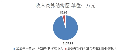 (一)部门财政资金收入情况。2020年本年收入合计2244.90万元,其中:一般公共预算财政拨款收入2157.98万元,占96.13%;政府性基金预算财政拨款收入86.92万元,占3.87%;上级补助收入0万元,占0%;事业收入0万元,占0%;经营收入0万元,占0%;附属单位上缴收入0万元,占0%;其他收入0万元,占0%。
