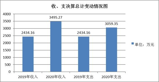 2020年度收入3495.27万元,支出3059.35万元,年末结转结余435.92万元。与2019年相比,收入增加1061.11万元,增长43.59%;支出增加625.19万元,增长25.68%。主要变动原因是抗疫特别国债的增加。