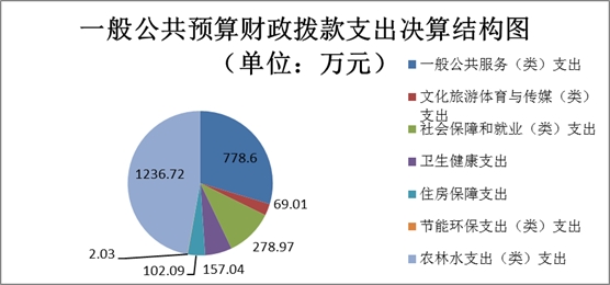 其中按功能科目分:2020年一般公共预算财政拨款支出2624.46万元,主要用于以下方面:一般公共服务(类)支出778.6万元,占29.67%;育支出(类)0万元,占0%;科学技术(类)支出0万元,占0%;文化旅游体育与传媒(类)支出69.01万元,占2.63%;社会保障和就业(类)支出278.97万元,占10.63%;卫生健康支出157.04万元,占5.98%;住房保障支出102.09万元,占3.89%;节能环保支出(类)支出2.03万元,占0.07%;农林水支出(类)支出1236.72万元,占47.13%。