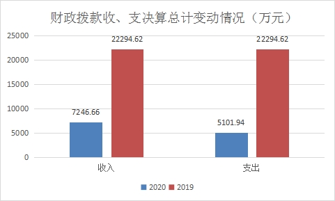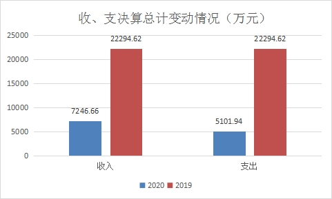 2020年度收入总计7246.66万元,支出总计5101.94万元,用事业基金弥补收入0万元,全年结余分配2144.72万元。与2019年相比,收入总计减少15047.96万元,下降67.50%,主要变动原因:一是人员工资福利和机关运行经费减少;二是债务付息减少;三是货币化安置征地拆迁补助减少。支出总计减少17192.68万元,下降77.12%,主要变动原因:一是人员工资福利和机关运行经费减少;二是债务付息减少;三是货币化安置征地拆迁补助减少。