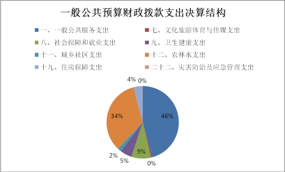 2020年一般公共预算财政拨款支出1847.41万元,主要用于以下方面:一般公共服务(类)支出846.89万元,占45.84%;文化旅游体育与传媒(类)支出9.57万元,占0.52%;社会保障和就业(类)支出160.15万元,占8.67%;城乡社区(类)支出31.53万元,占1.71%;农林水(类)支出627.06万元,占33.94%;住房保障(类)支出73.17万元,占3.96%;灾害防治及应急管理(类)2万元,占0.11%。