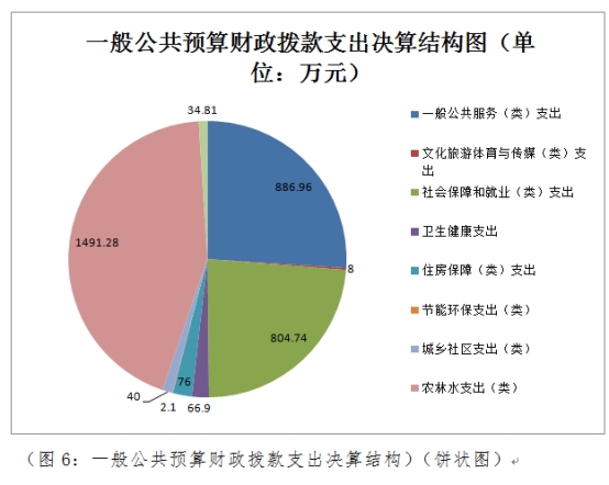 2020年一般公共预算财政拨款支出2686.54万元,主要用于以下方面:一般公共服务(类)支出886.96万元,占33.01%;文化旅游体育与传媒(类)支出8万元,占0.2%;社会保障和就业(类)支出80.47万元,占29.95%;卫生健康支出66.9万元,占2.5%;住房保障(类)支出76万元,占2.8%;节能环保支出(类)支出2.1万元,占0.07%;城乡社区支出(类)支出40万元,占1.5%;农林水支出(类)支出1491.28万元,占55.51%,抗疫特别国债安排的支出34.81万元,占1.3%。