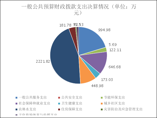 2021年一般公共预算财政拨款支出4883.10万元,主要用于以下方面:一般公共服务支出994.98万元,占20.3%;公共安全支出5.69万元,占0.12%;节能环保支出122.11万元,占2.5%;文化旅游体育与传媒支出52.53万元,占1.07%;社会保障和就业支出646.68万元,占13.24%;卫生健康支出173.03万元,占3.54%;城乡社区支出448.98万元,占9.19%;农林水支出2221.82万元,占45.5%;住房保障支出181.78万元,占3.72%;灾害防治及应急管理支出35.5万元,占0.82%。
