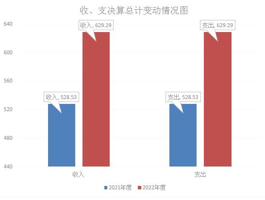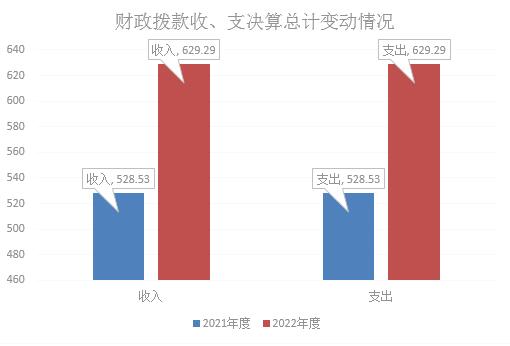 2022年度收、支总计629.29万元。与2021年相比,收、支总计各增加100.76万元,增长19.06%。增加的主要原因是从2022年开始县财政增设了县级部门公共财力运行补助、公务员基础绩效奖按月发放以及调入2名公务员。