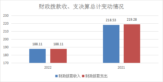 2022年财政拨款收入188.11万元,支出总计188.11万元。与2021年相比,财政拨款收入减少30.42万元,下降13.92%,主要变动原因是新冠疫情防控相关经费下拨于次年。支出总计减少31.17万元,下降14.21%。主要变动原因是新