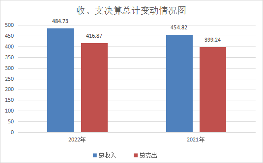 2022年度收入484.73万元,支出416.87万元。与2021年相比,收入增加29.91万元,增长6.58%,主要增加原因是事业收入增加;支出增加17.63万元,增长4.42%。主要变动原因是药品支出增加和新冠疫情防控相关支出增加。