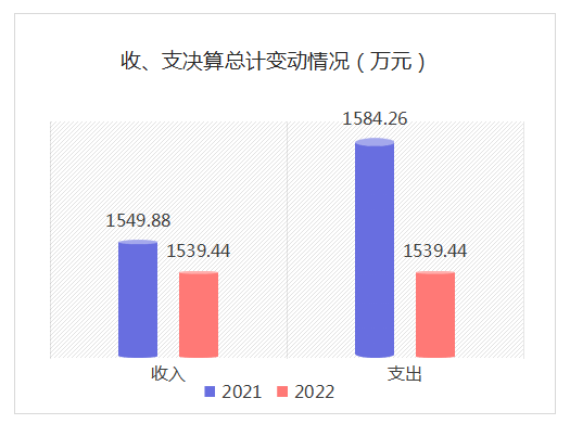 2022年度收入总计1539.44万元,支出总计1539.44万元。与2021年相比,收入总计减少10.44万元、下降0.67%;支出总计减少44.82万元,下降2.83%。主要变动原因是人员工资及社会保障支出变动。