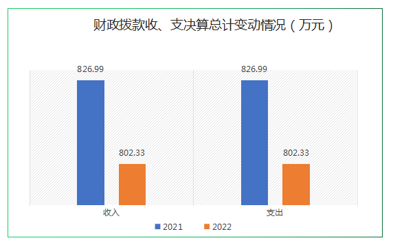 2022年财政拨款收入总计802.33万元,支出总计802.33万元。与2021年相比,财政拨款收入总计减少24.66万元,下降2.98%;支出总计减少24.66万元,下降2.98%。主要变动原因是政府性基金预算财政拨款的变动。