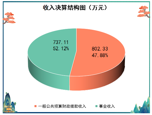 2022年本年收入合计1539.44万元,其中:一般公共预算财政拨款收入802.33万元,占52.12%;政府性基金预算财政拨款收入0万元;国有资本经营预算财政拨款收入0万元;上级补助收入0万元;事业收入737.11万元,占47.88%;经营收入0万元;附属单位上缴收入0万元;其他收入0万元。