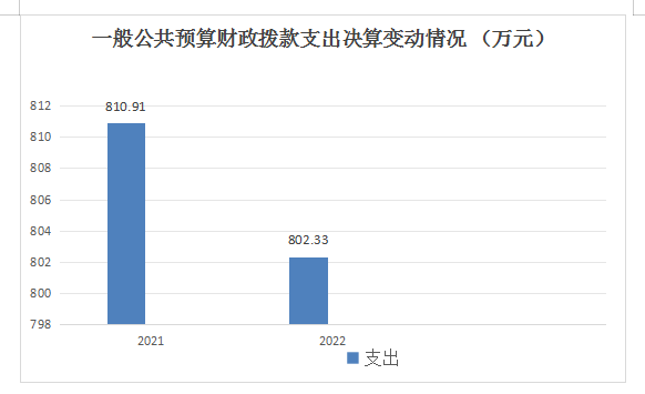 2022年一般公共预算财政拨款支出802.33万元,占本年支出合计的52.12%。与2021年相比,一般公共预算财政拨款支出减少8.58万元,下降1.06%。主要变动原因是人员工资及社会保障支出的变动。