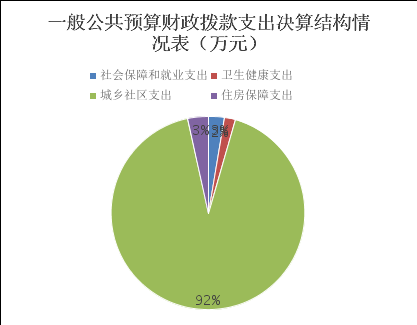 2022年一般公共预算财政拨款支出281.1万元,主要用于以下方面:社会保障和就业(类)支出7.69万元,占2.74%;卫生健康支出5.17万元,占1.84%;城乡社区(类)支出258.8万元,占92.03%;住房保障支出9.44万元,占3.36%。
