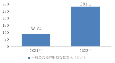 2022年一般公共预算财政拨款支出281.1万元,占本年支出合计的100%。与2021年88.64万元相比,一般公共预算财政拨款支出增加192.46万元,增长217.12%。主要变动原因是编人员经费按全额拨款预算和聘用人员经费由财政直接预算到单位。