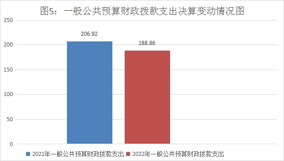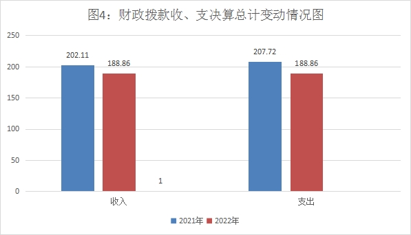 2022年财政拨款收入188.86万元。与2021年202.11万元相比,财政拨款收入减少13.25万元,下降6.56%。主要变动原因是人员经费减少。2022年财政拨款支出188.86万元。与2021年207.72万元相比,财政拨款收入减少18.86万元,下降9.08%。主要变动原因是人员经费减少。