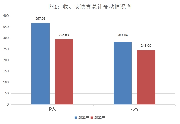2022年度收入总计293.65万元。与2021年367.58万元相比,收入下降73.93万元,下降20.11%。2022年度支出总计245.09万元。与2021年283.04万元相比,收入下降37.95万元,下降13.41%。主要变动原因是人员经费以及公用经费的减少。