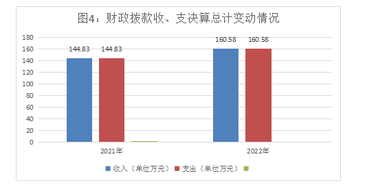 2022年财政拨款收160.58万元、支总计160.58万元。与2021年相比,财政拨款收入总计各增加15.75万元,财政拨款支出增加15.75万元,增长10.87%。主要变动原因是疫情防控费用增加。