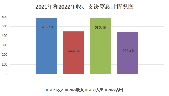 2022年度收、支总计444.86万元。与2021年相比,收、支总计各减少140.62万元,下降24.02%。主要变动原因是学生人数减少及学校校园环境的改善和学校校园文化的建设投入减少。