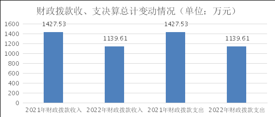 2022年财政拨款收、支总计1139.61万元。与2021年相比,财政拨款收、支总计各减少287.92万元,下降20.17%。主要变动原因是教职工人数减少及学校校园环境的改善和学校校园文化的建设投入减少。