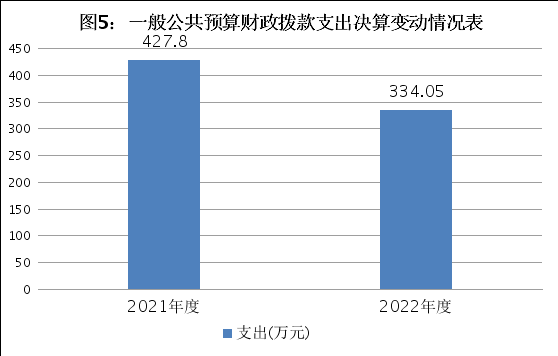 2022年一般公共预算财政拨款支出334.05万元,占本年支出合计的100%。与2021年相比,一般公共预算财政拨款支出减少93.75万元,下降21.91%。主要变动原因是教职工人数减少及学校校园环境的改善和学校校园文化的建设投入减少。