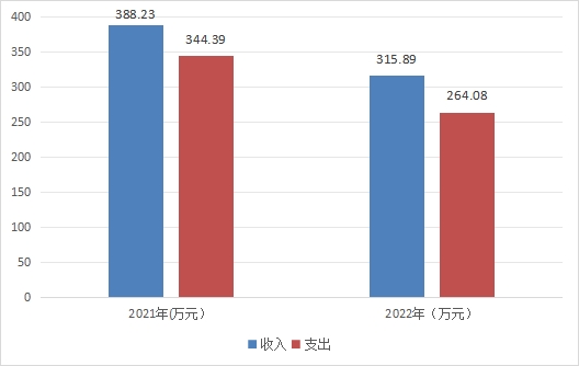 2022年度收入总计315.89万元,总支出264.08万元。与2021年相比,收入总计减少72.34万元,下降18.63%。主要变动原因是财政补助收入和事业收入减少;支出总计减少80.31万元,下降23.32%,主要变化原因是人员经费及疫情防控经费减少。