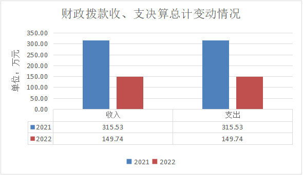 2022年财政拨款收、支总计149.74万元。与2021年相比,财政拨款收、支总计各减少165.79万元,下降52.54%。主要变动原因是宣传氛围营造项目未开展。