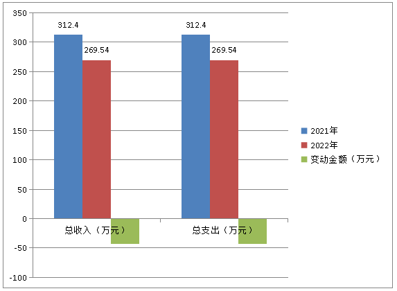 2022年度总收入269.54万元,总支出269.54万元,其中本年支出249.41万元,结余分配20.13万元,年末结转和结余0万元。与2021年相比,收入总计减少42.86万元,下降13.72%,主要变动原因是新冠疫情影响致业务收入下滑。支出总计减少42.86万元,下降13.72%。主要变动原因是业务下滑致材料支出减少;厉行节约,节省开支。