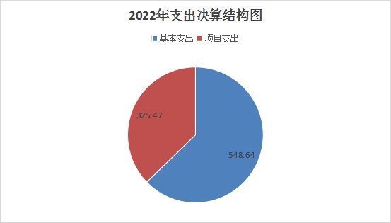 2022年本年支出合计874.11万元,其中:基本支出548.64万元,占62.77%;项目支出325.47万元,占37.23%;上缴上级支出0万元,占0%;经营支出0万元,占0%;对附属单位补助支出0万元,占0%。