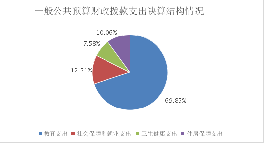 2022年一般公共预算财政拨款支出1298.95万元,主要用于以下方面:一般公共服务(类)支出0万元,占0%;教育支出(类)907.31万元,占69.85%;科学技术(类)支出0万元,占0%;文化旅游体育与传媒(类)支出0万元,占0%;社会保障和就业(类)支出162.43万元,占12.51%;卫生健康支出130.72万元,占7.58%;住房保障支出130.71万元,占10.06%。