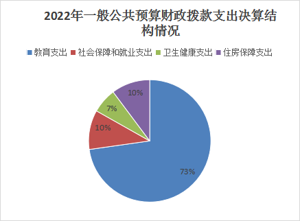 2022年一般公共预算财政拨款支出1638.22万元,主要用于以下方面:一般公共服务(类)支出0万元,占0%;教育支出(类)1192.33万元,占72.76%;科学技术(类)支出0万元,占0%;文化旅游体育与传媒(类)支出0万元,占0%;社会保障和就业(类)支出170.61万元,占10.41%;卫生健康支出108.42万元,占6.62%;住房保障支出167.4万元,占10.22%。