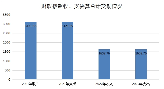 2022年财政拨款收、支总计1638.76万元。与2021年相比,财政拨款收、支总计各减少1482.79万元,减少47.5%。主要变动原因是财政拨款减少。