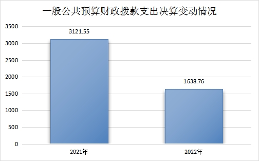2022年一般公共预算财政拨款支出1638.76万元,占本年支出合计的68.22%。与2021年相比,一般公共预算财政拨款支出减少1482.79万元,减少47.50%。主要变动原因是财政拨款减少。