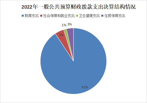 2022年一般公共预算财政拨款支出184.96万元,主要用于以下方面:一般公共服务(类)支出0万元,占0%;教育支出(类)167.79万元,占91%;科学技术(类)支出0万元,占0%;文化旅游体育与传媒(类)支出0万元,占0%;社会保障和就业(类)支出8.28万元,占4.48%;卫生健康支出2.61万元,占1.41%;住房保障支出6.28万元,占3.4%。