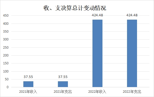 2022年度收、支总计424.48万元。与2021年相比,收、支总计各增加386.93万元,增加1030.44%。主要变动原因是2021年未招生,2022年春季开园,学生和教师人数增加,财政拨款和事业收入增加。