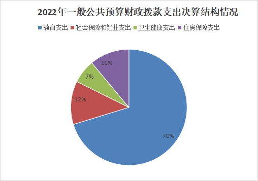 2022年一般公共预算财政拨款支出2323.94万元,主要用于以下方面:一般公共服务(类)支出0万元,占0%;教育支出(类)1632.42万元,占70.24%;科学技术(类)支出0万元,占0%;文化旅游体育与传媒(类)支出0万元,占0%;社会保障和就业(类)支出280.5万元,占12.07%;卫生健康支出154.44万元,占6.65%;住房保障支出256.57万元,占11.04%。