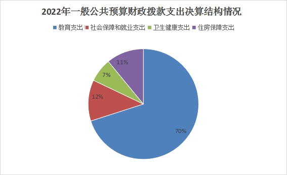 2022年一般公共预算财政拨款支出1645.97万元,主要用于以下方面:一般公共服务(类)支出0万元,占0%;教育支出(类)1152.81万元,占70.04%;科学技术(类)支出0万元,占0%;文化旅游体育与传媒(类)支出0万元,占0%;社会保障和就业(类)支出198.12万元,占12.04%;卫生健康支出114.88万元,占6.98%;住房保障支出180.15万元,占10.94%。