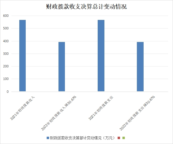 2022年财政拨款收、支总计394.38万元。与2021年相比,财政拨款收、支总计各减少172.85万元,下降30.47%。主要变动原因是均衡迎检结束、学校师生人数减少,学校校园环境的改善和学校校园文化的建设投入减少。