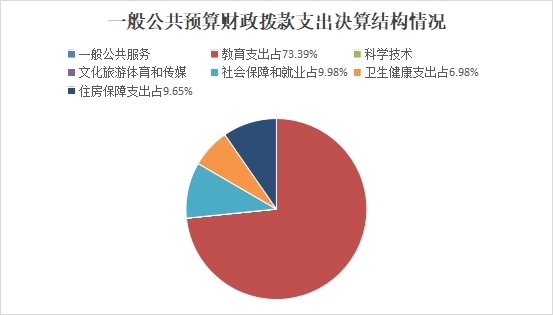 2022年一般公共预算财政拨款支出394.38万元,主要用于以下方面:一般公共服务(类)支出0万元,占0%;教育支出(类)289.44万元,占73.39%;科学技术(类)支出0万元,占0%;文化旅游体育与传媒(类)支出0万元,占0%;社会保障和就业(类)支出39.37万元,占9.98%;卫生健康支出27.52万元,占6.98%;住房保障支出38.05万元,占9.65%。