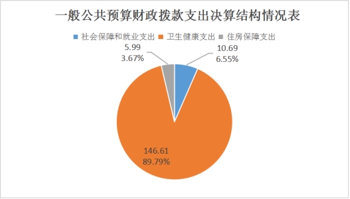 一般公共服务(类)支出0万元,占0%;教育支出(类)0万元,占0%;科学技术(类)支出0万元,占0%;文化旅游体育与传媒(类)支出0万元,占0%;社会保障和就业(类)支出10.69万元,占6.55%;卫生健康支出146.61万元,占89.79%;住房保障支出5.99万元,占3.67%。